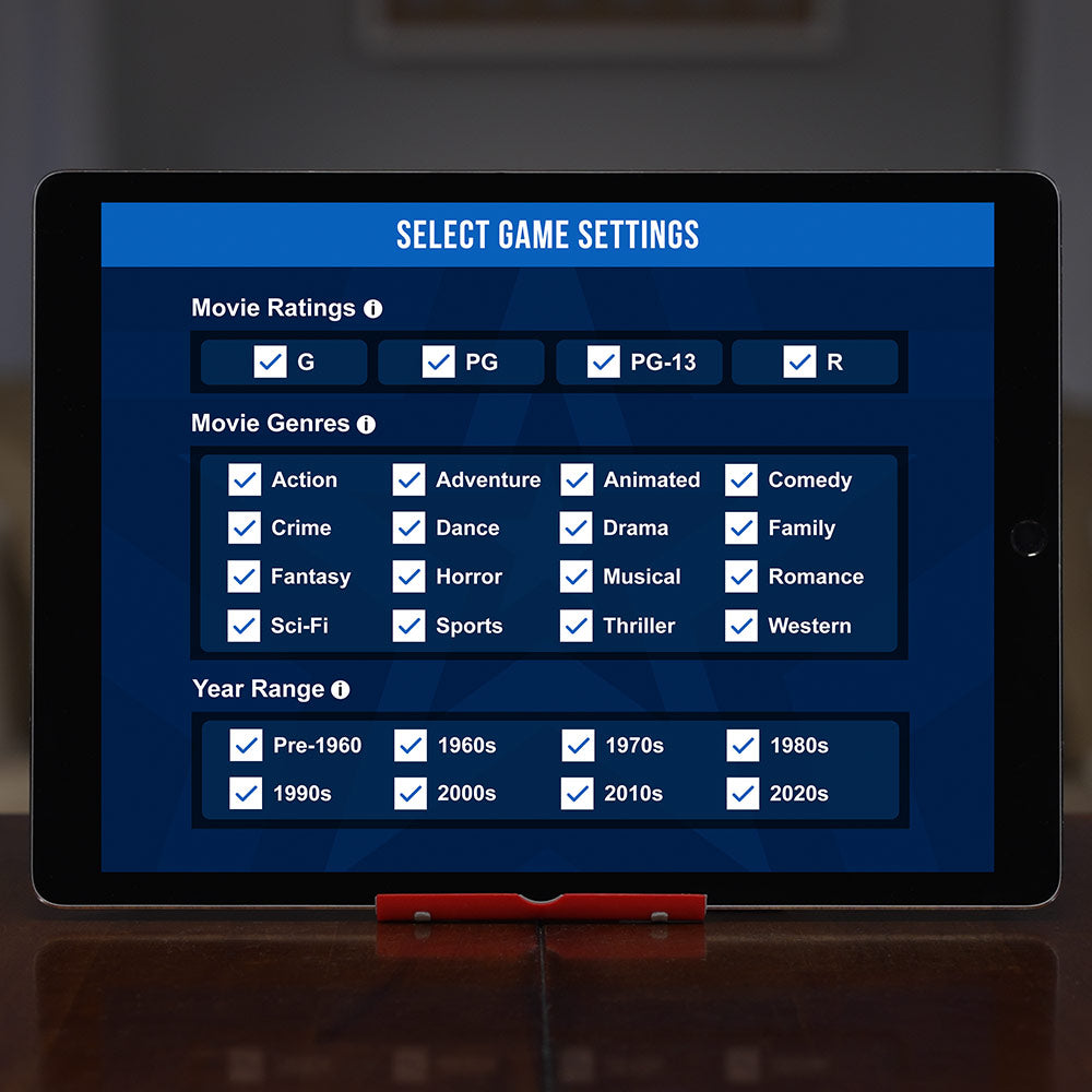 The movie ratings, genres and decades of movie questions are entirely selectable. Expansion packs will also be available, so you won’t need to buy a new game just to get more movie titles.