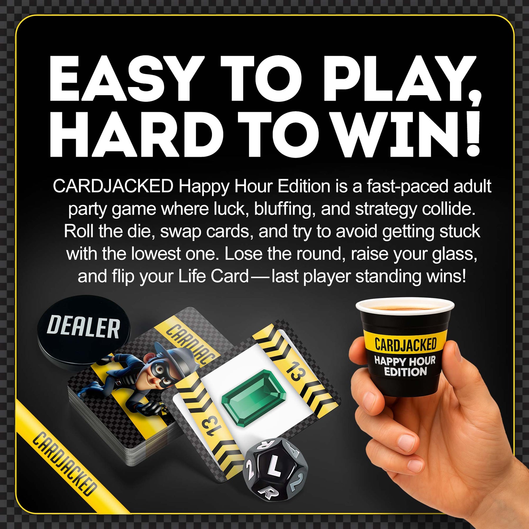 CARDJACKED Happy Hour Edition is intended for adults 21 and over. Alcohol consumption is not required to enjoy this game. Please play and drink responsibly.